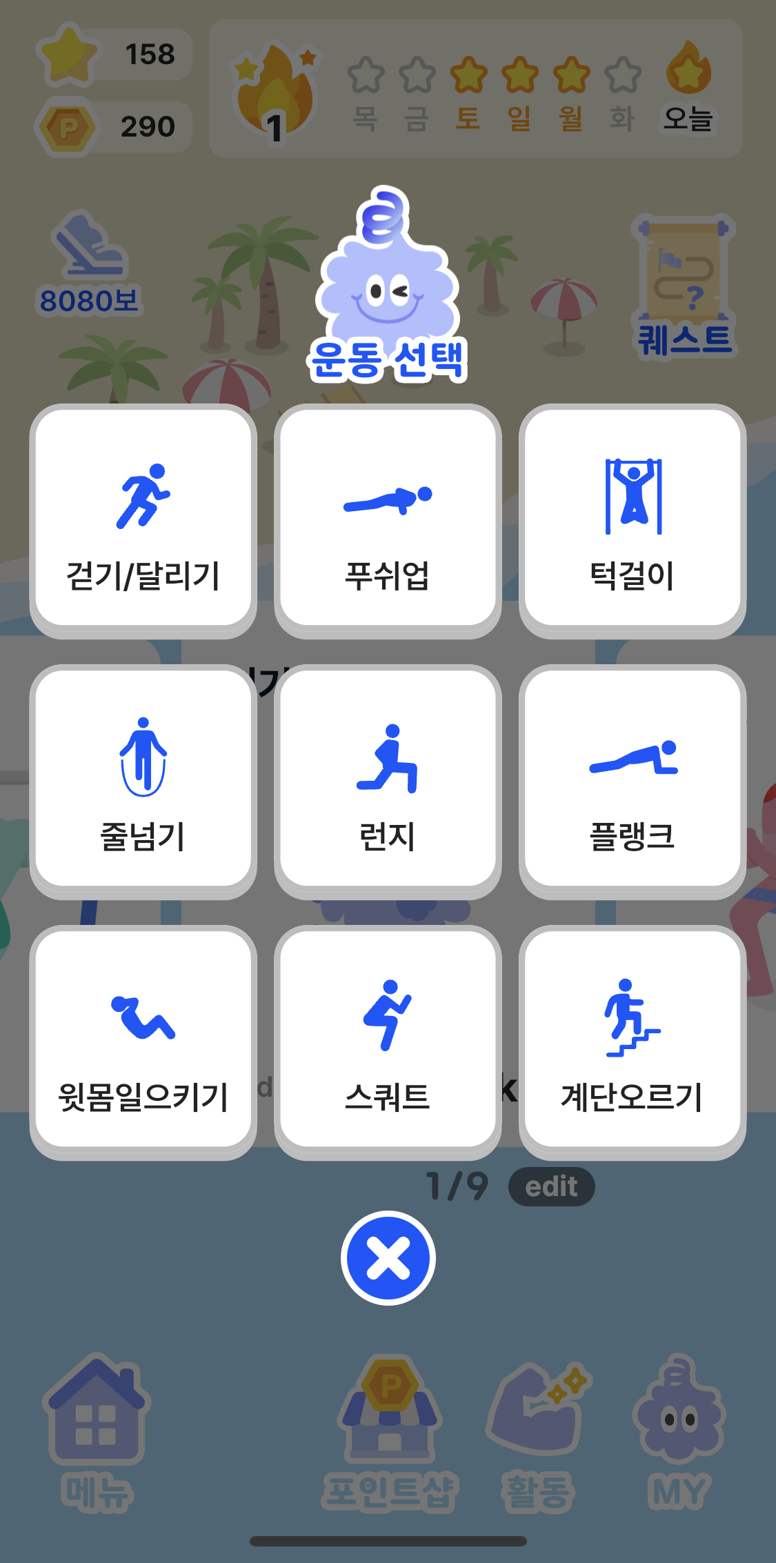 운동을 수행하면 별도 받고, 퀘스트도 클리어 하면서 별을 모을 수 있고