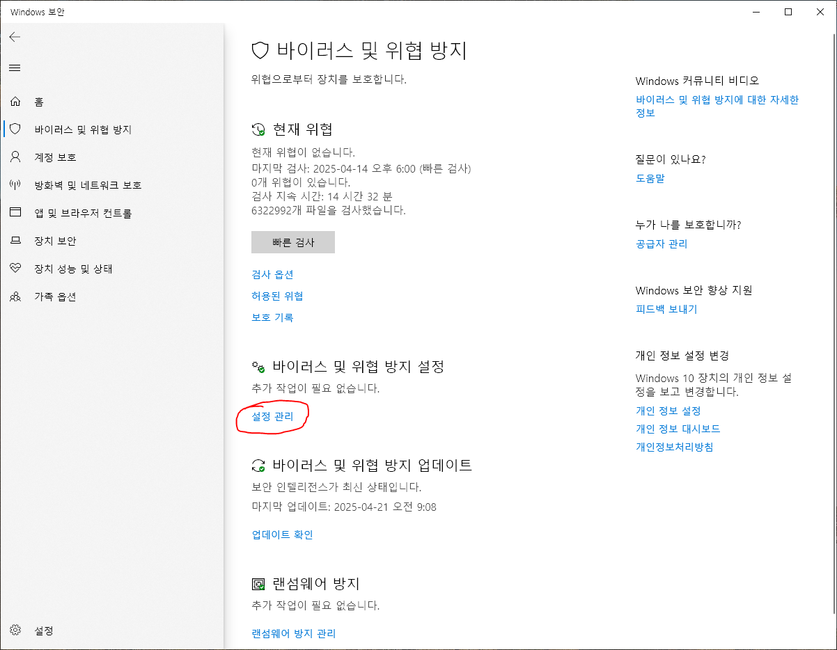 바이러스 및 위협 방지 설정 - 설정관리